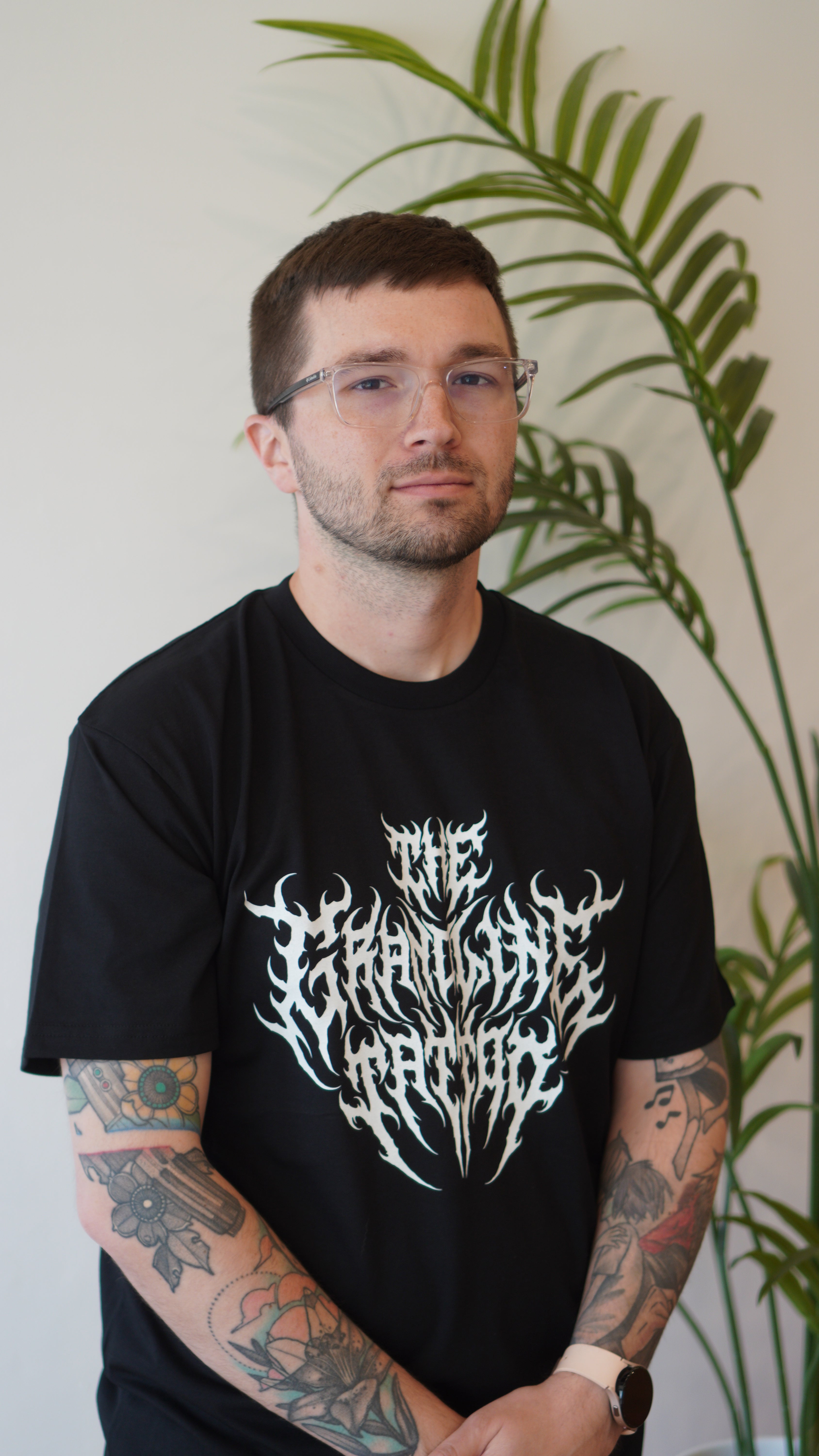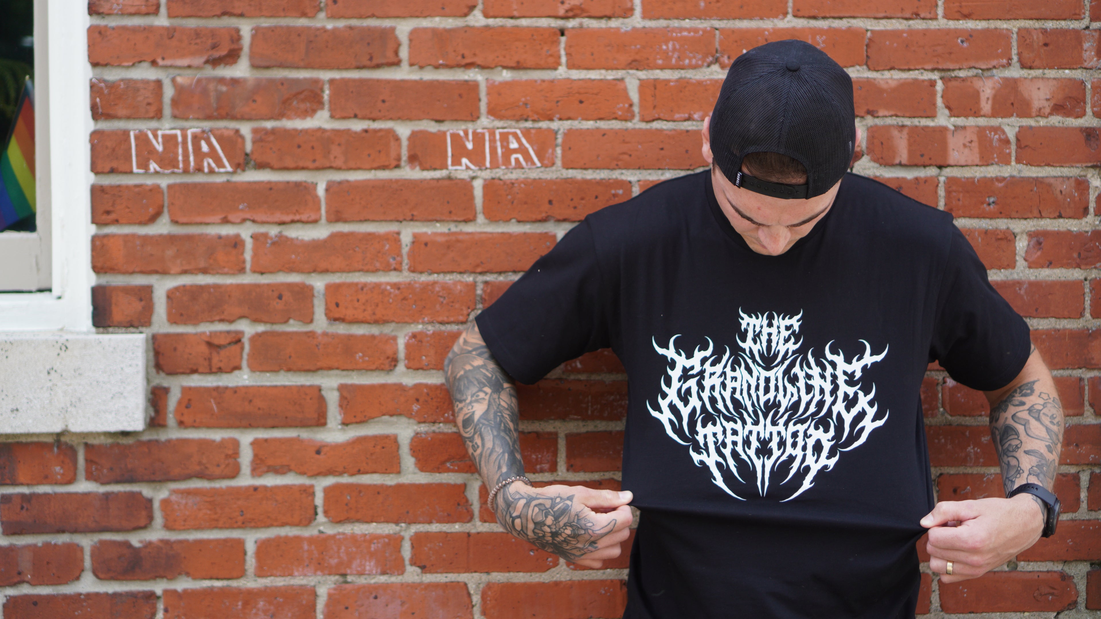 THIS IS A PRE-ORDER ITEM AND WILL SHIP LATE JUNE-EARLY JULY Welcome our new shop shirt with our name in a deathcore-style typeface. Locally made in Indianapolis with 100% cotton, this relaxed-fit unisex shirt is designed for the studio, the street, and the show.